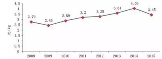 2015年,中國生鮮乳價格低迷,年初價格快速下跌, 年中價格低位徘徊,第四季度略有回升。據監測,10個主產省區(河北、山西、內蒙古、遼寧、黑龍江、山東、河南、陜西、寧夏、新疆。)全年平均價格 3.45元/kg,同比下降14.8%。2008年以來,生鮮乳價格年均漲幅3.1%,小于牛奶零售價格年均6.9%的漲幅(圖3)。