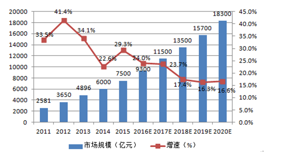 2011-2020 年中國物聯網整體規模及增長預測(億元)