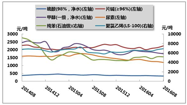 圖12 2014年8月-2016年8月我國(guó)部分化工產(chǎn)品月平均價(jià)格走勢(shì)