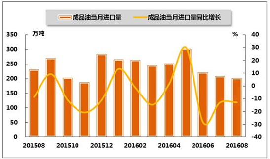 圖6 2015年8月-2016年8月我國(guó)成品油產(chǎn)量及同比增長(zhǎng)率