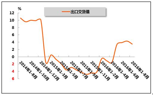 2016年1-8月,化工行業(yè)累計(jì)出口交貨值在連續(xù)12個(gè)月負(fù)增長(zhǎng)后,出現(xiàn)扭轉(zhuǎn)局面。國(guó)家統(tǒng)計(jì)局?jǐn)?shù)據(jù)顯示,2016年1-8月化工行業(yè)累計(jì)出口交貨值2740.4億元,同比增長(zhǎng)3.5%,增速較今年1-7月回落0.8個(gè)百分點(diǎn),而上年同期為同比下降3.6%。