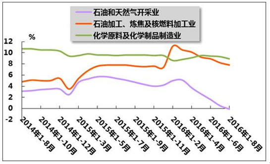 圖3 2014年8月-2016年8月石油和化工行業(yè)增加值累計(jì)同比增速變動(dòng)趨勢(shì)