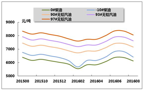 圖11 2015年8月-2016年8月中國(guó)主要成品油月平均價(jià)格