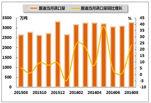 圖14 2015年8月-2016年8月同期我國(guó)原油累計(jì)進(jìn)口量及同比增長(zhǎng)率