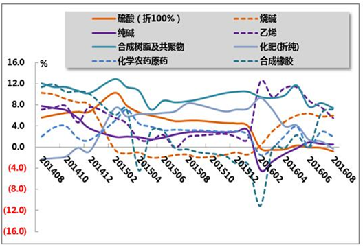 表3 2016年1-8月我國(guó)主要化工產(chǎn)品產(chǎn)量名稱自年初累計(jì)產(chǎn)量累計(jì)同比(萬(wàn)噸)(%)硫酸(折100%)5823.9-0.8燒堿(折100%)2141.86純堿16840.5乙烯1204.55.5合成樹脂及共聚物5349.97.4合成橡膠351.77.2化肥總計(jì)(折純)4927.9-0.3化學(xué)農(nóng)藥原藥(折100%)249.22圖7 2014年8月-2016年8月我國(guó)主要化工產(chǎn)品累計(jì)產(chǎn)量同比增速