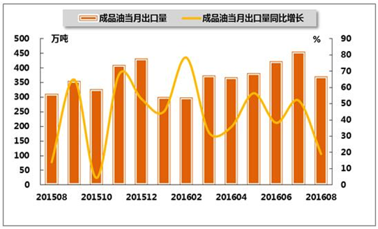 2016年8月份,我國(guó)成品油出口371萬(wàn)噸,同比增長(zhǎng)19.1%,增速較今年7月回落32.9個(gè)百分點(diǎn),較上年同期提高5.0個(gè)百分點(diǎn)。2016年1-8月,我國(guó)成品油累計(jì)出口量為2975萬(wàn)噸,同比增長(zhǎng)42.3%,增速較今年1-7月回落4.0個(gè)百分點(diǎn),較上年同期提高32.9個(gè)百分點(diǎn)。