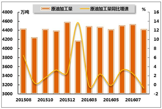 圖5 2015年8月-2016年8月我國(guó)原油加工量及同比增長(zhǎng)率