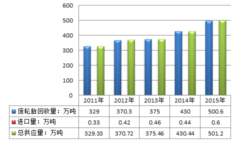 目前,我國廢舊輪胎除了國內(nèi)廢舊輪胎產(chǎn)生外,還從國內(nèi)進(jìn)口廢舊輪胎。2015年我國廢舊輪胎總供應(yīng)量為501.1萬噸。其中進(jìn)口約0.5萬噸,國內(nèi)回收量約500.6 萬噸。
