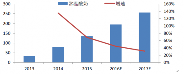 常溫酸奶過去三年復合增速80%,未來仍有望快速發展。常溫酸奶2015年預計市場規模在130-140億元,同比增長70%左右,過去三年復合增速約80%,未來仍有望較快發展。按照未來5年20%-25%復合增速計算,到2020年常溫酸奶規模有望達到350-400億元左右。