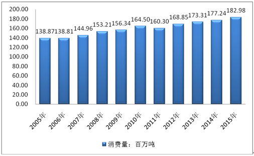 2005-2015年伊朗石油消費量走勢圖(單位:百萬噸)