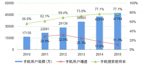 截至2015年12月,手機(jī)搜索用戶數(shù)達(dá)4.78億,使用率為77.1%,用戶規(guī)模較2014年底增長4870萬,增長率為11.3%。手機(jī)搜索是整體搜索引擎市場快速發(fā)展的持續(xù)推動力:2011年至今,手機(jī)搜索用戶規(guī)模年增長速度一直快于搜索引擎領(lǐng)域整體,在全國互聯(lián)網(wǎng)滲透率、搜索引擎使用率長期保持小幅增長的背景下,手機(jī)搜索使用率的增長幅度更大。