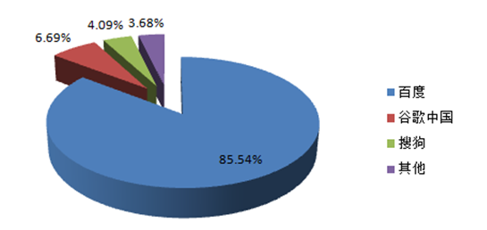 2015年第4季度,在不含渠道及海外收入的中國搜索引擎運營商市場收入份額中,百度占到85.54%,搜狗為6.69%,谷歌中國為4.09%,其他為3.68%。