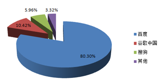 2015年第4季度,在未含渠道收入的中國搜索引擎運營商市場收入份額中,百度占到80.30%,谷歌中國為10.42%,搜狗為5.96%,其他為3.32%。