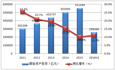 2011-2016年中國固定資產投資及增長速度