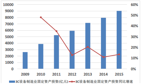 核心提示:我國3C制造業增速依舊強勁,帶動相關產業繼續發展。根據國家統計局的數據顯示,2015年我國3C制造業累計完成固定資產投資9035億元,同比增長13.62%,盡管宏觀經濟增速放緩,但3C 制造業需求來自于消費類產業,產業景氣度依舊較高。200我國3C制造業增速依舊強勁,帶動相關產業繼續發展。根據國家統計局的數據顯示,2015年我國3C制造業累計完成固定資產投資9035億元,同比增長13.62%,盡管宏觀經濟增速放緩,但3C 制造業需求來自于消費類產業,產業景氣度依舊較高。