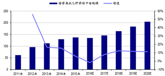 近年來,我國治療乙肝用藥的市場規模已從 2011 年的 68.81 億元增長到 2015 年的 162.76 億元, CAGR 為 22.4%,增速較快。其中醫院市場是肝病藥物銷售的主要渠道,市場份額占比約為 80%。 預計到 2020 年我國乙肝用藥市場規模將達到 200 億元。