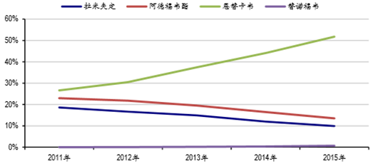 2011-2015 年不同類核苷類抗乙肝藥物市場份額變化