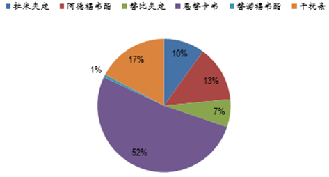在我國抗乙肝藥物市場中,恩替卡韋已經成為我國治療乙肝的主要用藥。根據 IMS 數據,2015 年, 恩替卡韋的銷售額約占抗乙肝藥物市場的 52%,其次是干擾素類藥物,占比約 17%,而拉米夫定 和阿德福韋酯用藥只在 20%左右。