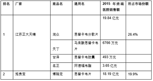 2015 年我國 IMS 終端醫院乙肝藥物銷售前十家企業