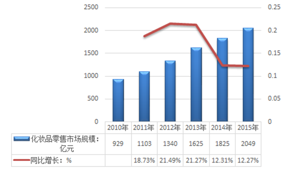 近年來,中國的化妝品零售市場一直在穩(wěn)定增長,雖然 14 年增速有所放緩,但仍是全球范圍內(nèi)增長最快速的地區(qū)之一。2015年我國化妝品零售市場規(guī)模達(dá)到2049億元。