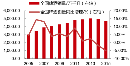 核心提示:我國啤酒行業近幾年一直處于下行期,增速不斷下滑,自 2014 年開始全國啤酒銷量首次出現負增長,2015 年負增長趨勢繼續擴大,增速下滑至-4.97%,同時,我國進口啤酒數量從 2008 年開始就呈現直線上升趨勢,2016 年 9月,我國進我國啤酒行業近幾年一直處于下行期,增速不斷下滑,自 2014 年開始全國啤酒銷量首次出現負增長,2015 年負增長趨勢繼續擴大,增速下滑至-4.97%,同時,我國進口啤酒數量從 2008 年開始就呈現直線上升趨勢,2016 年 9月,我國進口啤酒數量達到 51.2 9 萬千升,較 2008 年 9 月同比上漲幅度高達 2188%,在國內行業景氣不佳,外來進口啤酒沖擊的雙重夾擊下,我國國內啤酒企業的整體業績表現不佳,主要啤酒企業營收從 2013 年開始均呈現下滑趨勢,到 2015 年,四家上市公司銷量均出現了負增長,其中燕京啤酒負增長幅度最大,2015年燕京啤酒銷量下降了9.23%,青島啤酒緊隨其后,2015 年銷量下滑 7.36%。