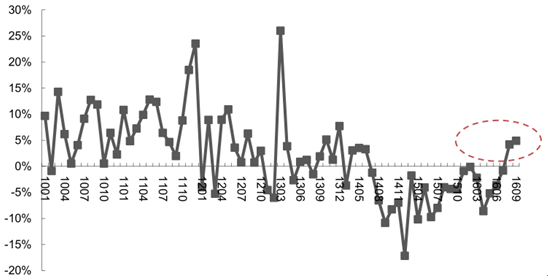 2010 年1月至 2016 年9 月全國啤酒產量當月同比