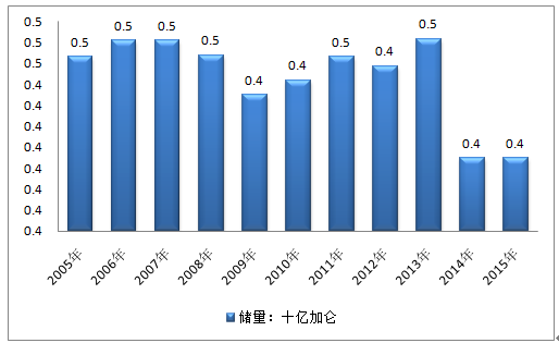 2005-2015年泰國石油儲量走勢圖(單位:十億加侖)