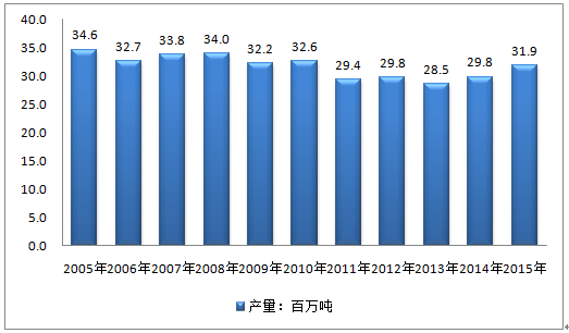 2005-2015年馬來西亞石油產量走勢圖(單位:百萬噸)