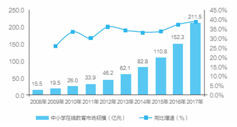2008- 2017年中國K12網絡教育市場規模及預測(單位:億元,%)