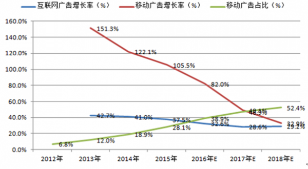 2012-2018年中國互聯網廣告及移動廣告市場規模增長率