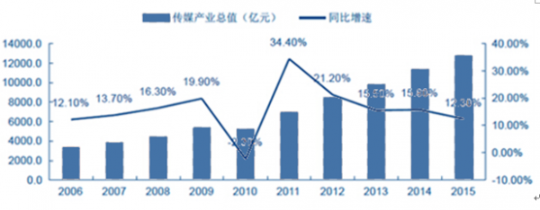 2015年以來,經濟增速的持續放緩使得產業轉型升級的需求不斷增強,新興產業被市場寄予了深切的期望。消費的擴容和技術的升級成為支撐文化傳媒產業持續健康發展的底層動力,傳媒行業持續進入中長期景氣階段。:2015年傳媒行業的整體市場規模達到12754億元,同比增長12.3%,相對于GDP增速高出5.6個百分點。