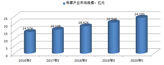 2016年我國傳媒產業市場規模將達到14,574億元,未來五年(2016-2020)年均復合增長率約為13.51%,2020年市場規模將達到24,195億元。