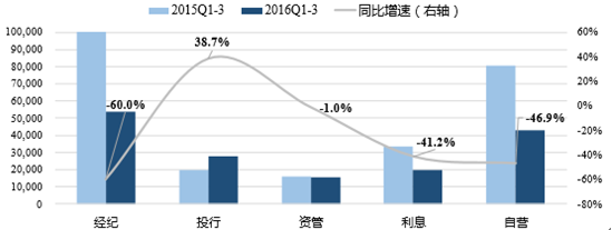 2016Q1-3、2015 Q1-3 上市券商各項業務收入及增速