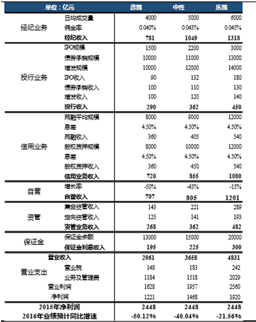 證券行業 2016 年業績預計將如期改善 由于 2015 年牛市業績高基數及 2016 年一季度市場大幅調整、成交 量銳減,2016 年上半年券商業績大幅下滑,但二季度以來隨著市場逐步 企穩,股指震蕩上行,券商前三季度業績降幅明顯收窄至 49.48%,行業 迎來業績拐點。此外,今年以來證券業監管政策全面推陳出新,短期推動 行業夯實基礎,中長期利好行業健康發展,隨著券商加速增資擴股提升 綜合實力,以及全牌照合資券商逐漸設立推動行業多元化發展,看好行 業未來發展前景。 基于前三季度業績狀況以及對2016年全年的日均成交量、承銷規模、 兩融平均規模、股債投資收益率等基本假設變量分三種情況進行彈性測 試,在悲觀、中性、樂觀假設下,2016 年證券行業整體凈利潤增速分別 為-50%、-40%、-22%。我們預計隨著年末市場行情向好,券商全年業績 有望如期改善,否極泰來,正式確立業績拐點。