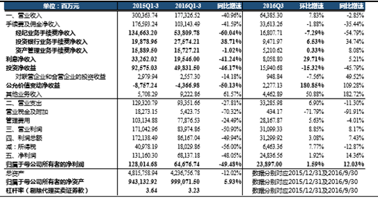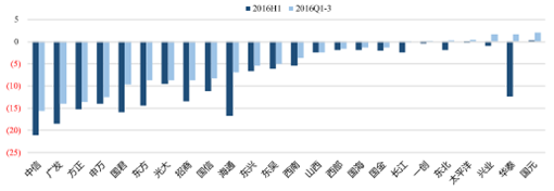 2016Q1-3 上市券商歸屬于母公司股東凈利潤降幅