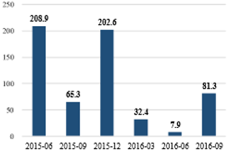2016H1、2016Q1-3 上市券商歸母其他綜合收益(單位:億元)