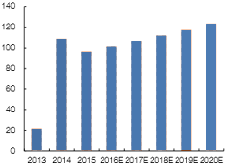 全球超級電容器市場將仍 2013 年的 8 億美元增長到 2018 年的 31.3 億美元,年復合增長率達到 30.2%。而石墨烯基超級電容器的產業化也在不斷推迚:在國內,中國 中車研収的 3 伏/12000 法拉石墨烯/活性炭復合電極超級電容和 2.8 伏/30000 法拉石墨烯納米 混合型超級電容已經獲得中國工程院鑒定,整體技術達到目前世界超級電容單體的最高水平。根據 測算,2016 年中國超級電容器市場規模將突破 30 億元,預計 2020 年中國超級電容器市場規模將 超迆 60 億元,到 2020 年,石墨烯在超級電容市場潛在應用規模達到 3~5 億元。