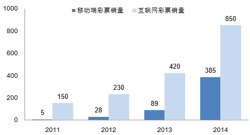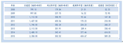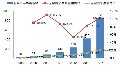 彩票產業在我國起步較晚,目前其銷售方式主要有實體門店銷售、電話銷售、互聯網 銷售三種方式。2008-2014 年,互聯網彩票銷售復合增速高達 86.81%,遠超過彩票整體市 場的增長速度。2014 年,互聯網彩票銷售規模為 850 億元,同比增長 102.38%,滲透率為 22.23%。按英國 GBGC 公布的 2014 年全球互聯網彩票平均滲透率 28.40%估算,未來我 國互聯網彩票市場空間在 2700 億元以上。