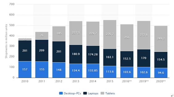 在 PC 方面,據統計和預測,全球 PC 市場已趨于穩定,2016~2020 年將維持在 5億部左右,其中具備無線通信功能(WiFi、藍牙等)的筆記本電腦和平板電腦的出貨量維持在 4 億部左右。