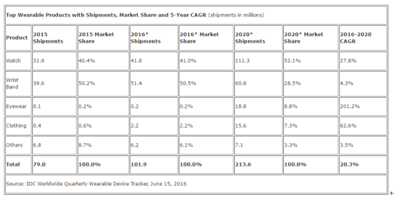在可穿戴智能設備方面,預計 2016 年全球出貨量將達到 1 億部,同比增長 29%,到 2020 年出貨量將達到 2 億部,CARG 約為 20%。