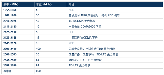 到 2020 年我國 5G 頻譜缺口近 1GHz,低頻段為首選,高頻將成為補充。目前 4G-LTE 頻段最高頻率的載波在 2GHz 上下,可用頻譜帶寬只有 100MHz。因此,如果使用毫米波頻段,頻譜帶寬能達到 1GHz-10GHz,傳輸速率也可得 到巨大提升。我國 5G 推進組已完成 2020 年我國移動通信頻譜需求預測,屆時移動通信頻譜需求總量為 1350~ 1810MHz,我國已為 IMT 規(guī)劃的 687MHz 頻譜資源均屬于 5G 可用頻譜資源,因此還需要新增 663~1123MHz 頻 譜。我國無線電管理“十三五”規(guī)劃中明確為 IMT-2020(5G)儲備不低于 500MHz 的頻譜資源。