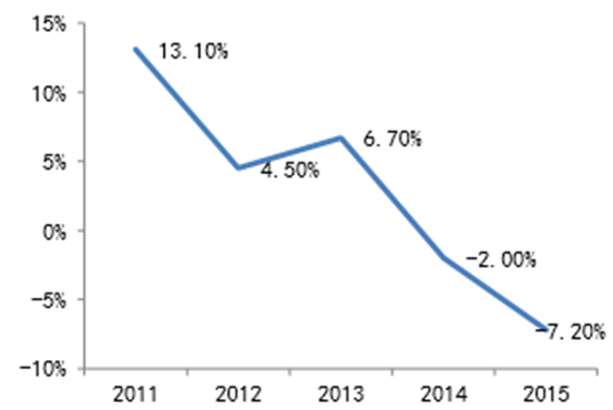 2015 年中國廣播媒體市場規模出現小幅下滑,央視索福瑞媒介研究有限公司(CSM) 的調查數據顯示,2015 年全國 34 個城市整體收聽率較 2014 年同比下降 3.33%。