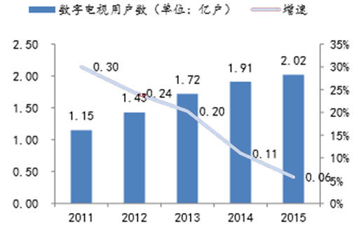 2015 年,我國有線電視用戶數預計為 2.4 億戶,有線數字電視家庭用戶數量 1.95 億 戶,數字化率達到 81.00%,其中:高清數字電視用戶占比逐年上升,用戶規模達到 5,466 萬戶,占全國有線電視用戶的 22.71%。由于有線數字電視用戶化率接近飽和上升空間不 足,預計 2016 年用戶增速將放緩。