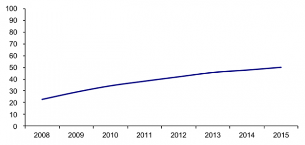 盡管整體電視廣告收入逐漸呈現(xiàn)下滑態(tài)勢,然而收視率有保障的強勢衛(wèi)視憑借擁有強大的平臺及資源,可以持續(xù)進行內容創(chuàng)新,在內容領先的基礎上,廣告收入仍然持續(xù)增長。據數(shù)據顯示,湖南廣告經營管理中心 2015 年創(chuàng)收為 109.1 億元,同比增長30.9%,超額全年任務 31.5%。