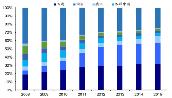 流量轉換為廣告收入。以百度為代表的搜索引擎,擁有搜索流量;以阿里巴巴為代表的電商平臺,擁有電商流量;以騰訊為代表的及時通訊社交軟件,擁有社交流量。這些巨大的網(wǎng)絡用戶流量,很容易吸引網(wǎng)民點擊瀏覽廣告,從而將用戶流量轉化成廣告收入,2015 年三家總計占據(jù)了網(wǎng)絡廣告市場 65.7%的市場份額。BAT 等巨頭對于網(wǎng)民聚集效應明顯,未來網(wǎng)絡廣告市場很可能出現(xiàn)強者愈強、弱者愈弱的市場格局。