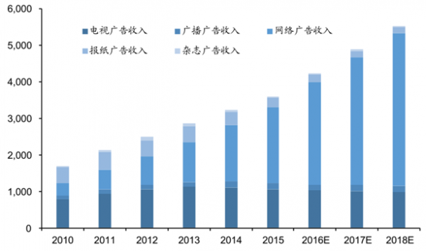 2010-2018中國五大媒體廣告收入規(guī)模及預測(億元)