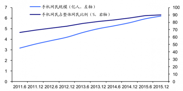 網(wǎng)民進一步向手機移動端集中,移動端的廣告市場空間巨大 。2015 年 12 月,我國網(wǎng)民規(guī)模達 6.9 億,互聯(lián)網(wǎng)普及率達到 50.3%,超過全球平均水平 3.9 個百分點,超過亞洲平均水平10.1個百分點。我國手機網(wǎng)民規(guī)模達 6.20 億,網(wǎng)民中使用手機上網(wǎng)的人群占比由 2014年的 85.8%提升至 90.1% 。