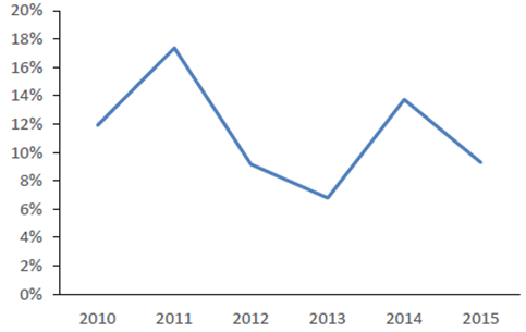 2010-2015年中國電飯煲銷售額同比增速走勢