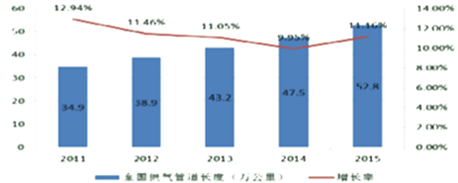 根據《全國城鎮燃氣發展“十二五”規劃》,“十二五”期間,我國新建城鎮燃 氣管道約25萬公里,到“十二五”期末,城鎮燃氣管網總長度達到60萬公里。目前我國已經形成了以西氣東輸、川氣東送、陜京一二線、忠武線、澀寧蘭線以及冀 寧線、淮武線為主框架的全國性天然氣干線網,截至2016年6月末,全國已經形 成一張橫貫東西、縱貫南北的天然氣基礎管網,覆蓋全國31個省份,95%以上的 地級市均用上了天然氣。“十三五”期間,將進一步完善天然氣管網,規劃建設陜京四線、西氣東輸四線、中俄東線、新疆和內蒙古煤制氣外輸管道等多條干線管道,基本建成調度靈活、供應穩定的全國性管網輸送體系,從而為天然氣的大規 模利用提供強有力的保障。