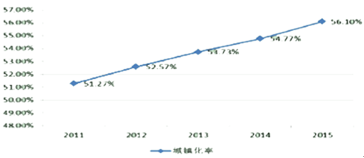 根據國家統計局的數據,2011-2015 年城鎮化率如下圖: